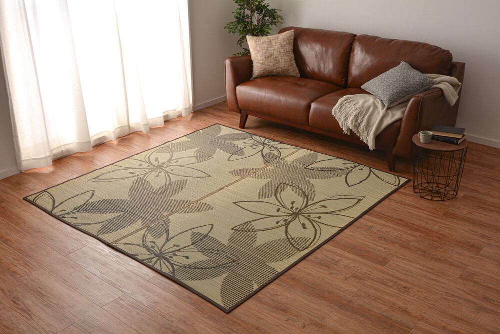 大きな花のデザインが人気のい草ラグ。い草がもつ湿度調整機能でサラリと爽やかな肌触りは、暑い季節を快適に過ごすには最適なアイテムです。裏面は、不織布加工で床を傷つけにくくなっています。