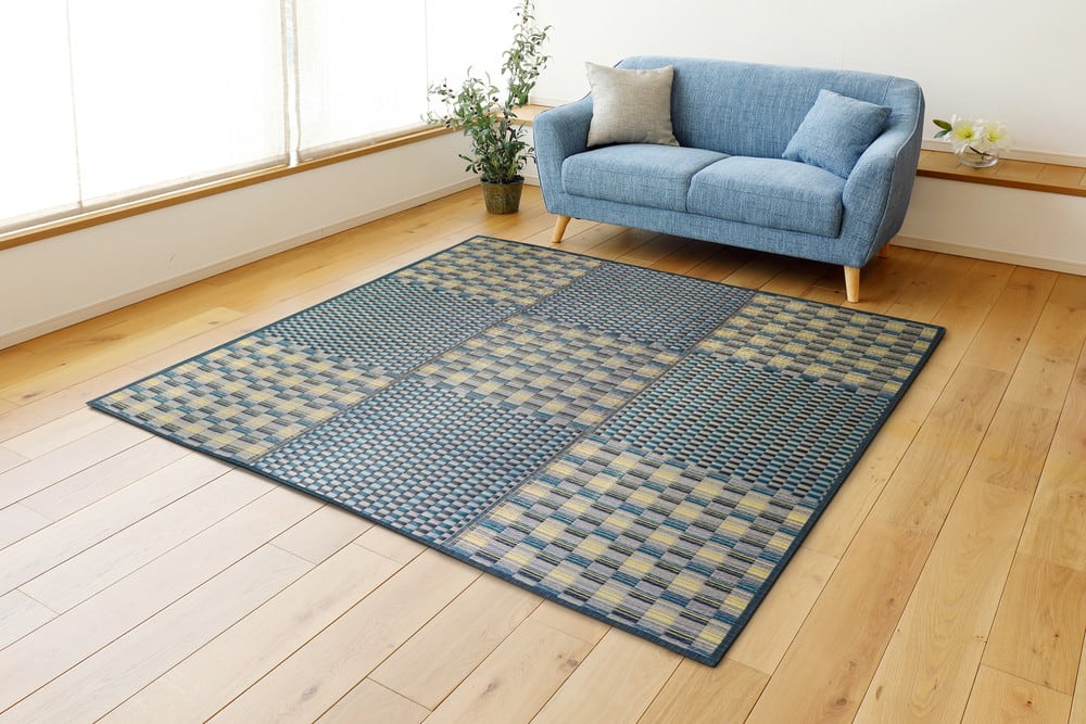 はっ水加工 ふっくらウレタン入り い草ラグ キハチ 約120×180cm ブルー
