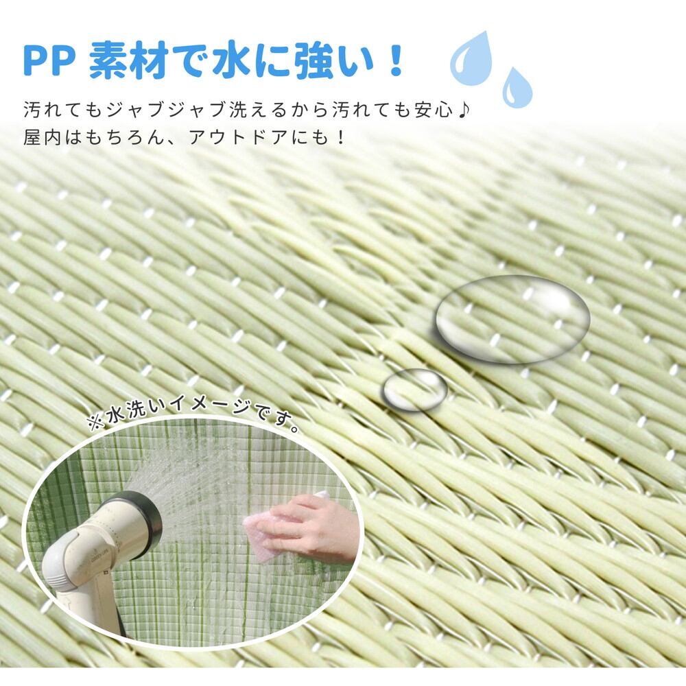 見た目はまるでい草のようなPP柄上敷き。抗菌加工付きで、細菌の増殖を抑制!お子さまやペットのいるご家庭も安心してお使いいただけます。水洗いできるので衛生的に、また海水浴場などの水辺でもお使いいただけます。また寒い地域ではビニール管内の空気層の保温効果を利用してあたたかく過ごすために冬に敷き詰めて使う家庭もあるそうです。