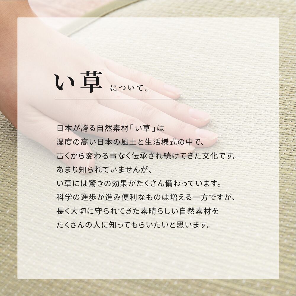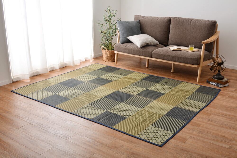 渋めの色使いで和モダンなデザインに織り上げたい草ラグ。い草がもつ湿度調整機能でサラリと爽やかな肌触りは、暑い季節を快適に過ごすには最適なアイテムです。裏面は、不織布で床を傷つけにくくなっています。