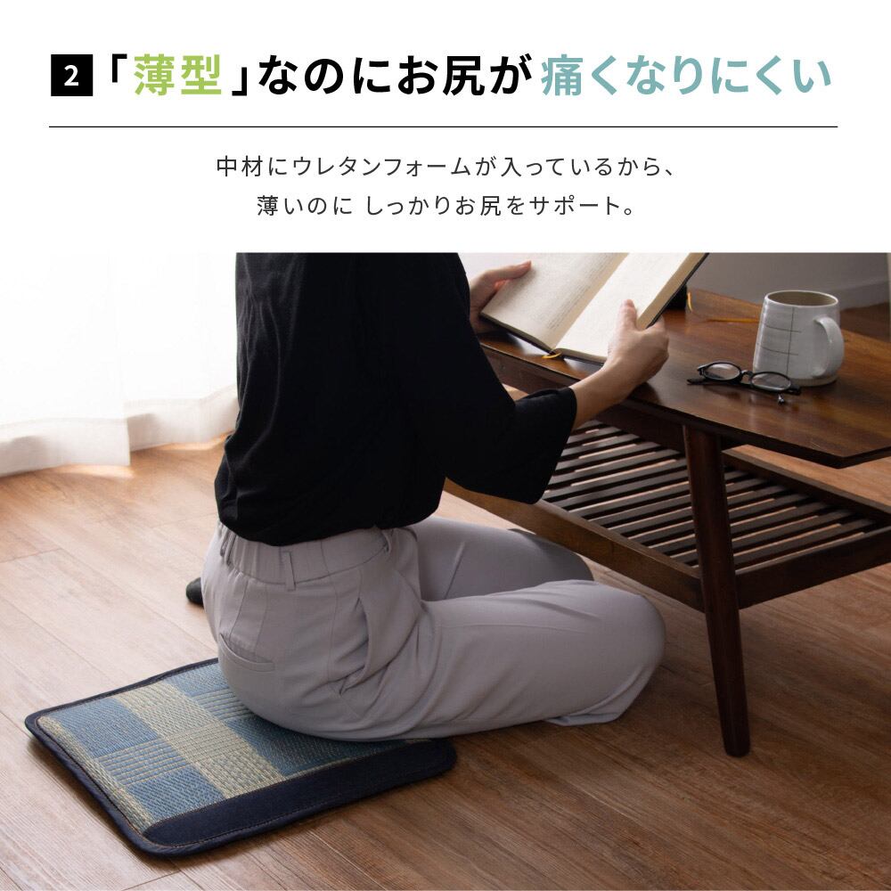 消臭や調湿機能もある優れた天然い草素材を使って織られたアイテムです。湿度の多い夏の季節でもサラサラのい草でべたつかず、ダイニングチェアや座る暮らしにピッタリの座布団です。