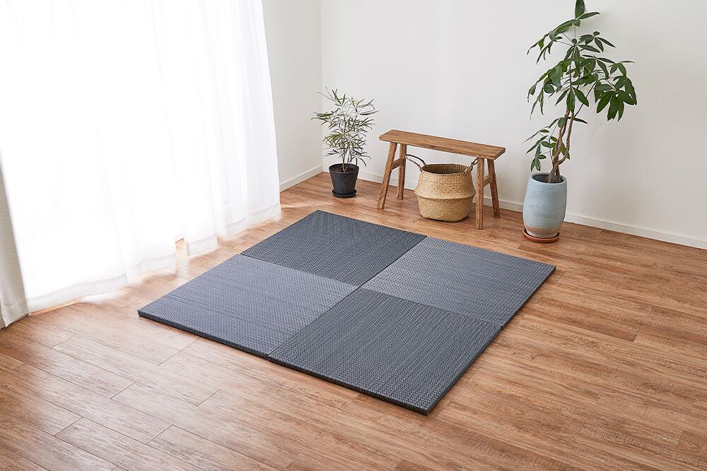適度なクッション性があり、階下への配慮や床のキズ防止など、子育て中にもうれしい便利グッズ。天然い草を使用し、等間隔な織り方でサラッとなめらかな手触り。い草の空気清浄や湿度調整機能で年中快適です。