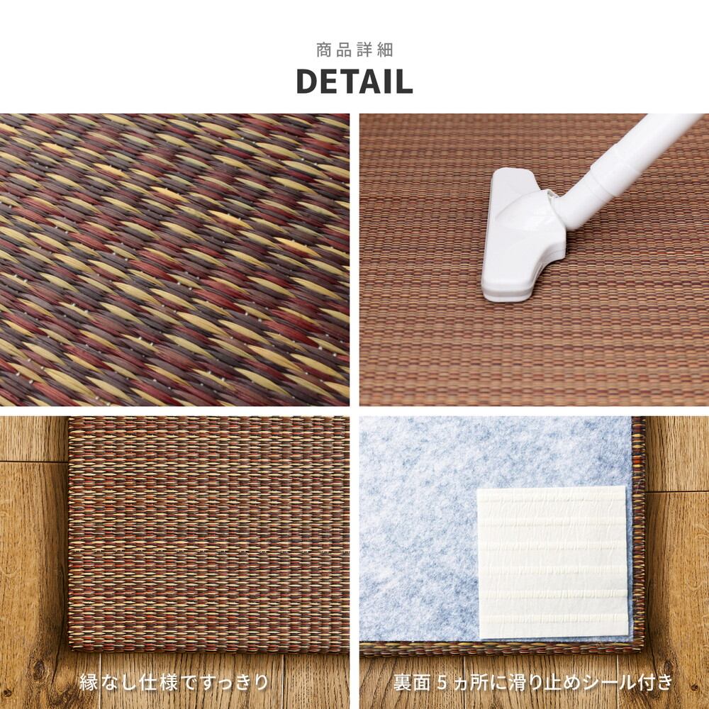 適度なクッション性があり、階下への配慮や床のキズ防止など、子育て中にもうれしい便利グッズ。天然い草を使用し、等間隔な織り方でサラッとなめらかな手触り。い草の空気清浄や湿度調整機能で年中快適です。
