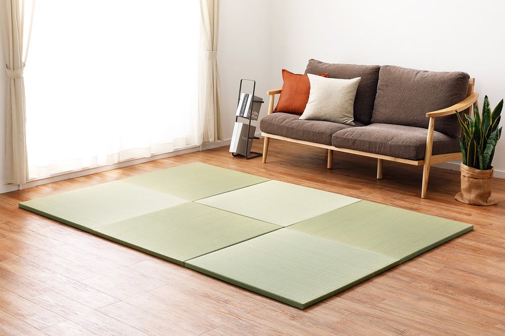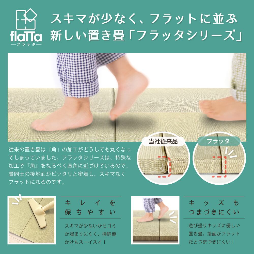 床に並べるだけで簡単に畳のスペ−スが作れる「置き畳」です。軽量なので女性1人でも取り扱いがラクラク。ちょっとした隙間スペ−スを有効活用できるのでキッズ向けのプレイマットからシニアのお昼寝、お父さんお母さんのごろ寝スペ−スまで簡単に作れます。適度なクッション性があり、階下への配慮や床のキズ防止など、子育て中にもうれしい便利グッズ。天然い草を使用し、等間隔な織り方でサラッとなめらかな手触り。い草の空気清浄や湿度調整機能で年中快適です。