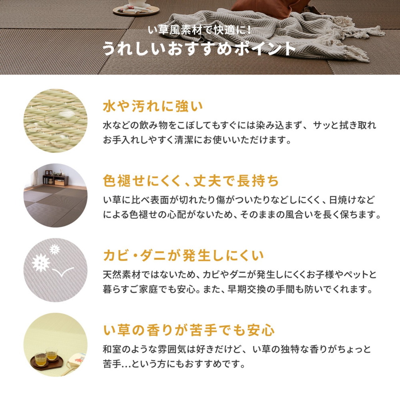 水に強い素材なので、ジュースなどをこぼしてもさっと拭き取れるから汚れても安心!子どもやペットのいるご家庭におすすめの『い草風』の置き畳。