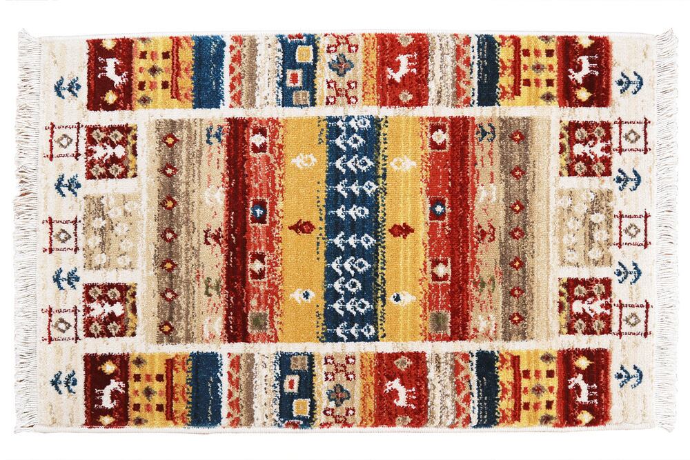 ラグの名産地トルコ製のウィルトンマット。民族調手織り絨毯の様なエスニックなデザインをウィルトン織機で織り上げました。毛足は1cm程ありますが密度が高く、掃除機もかけやすいようデザインされています。縦糸の特殊加工により生地がやわらかく、折りたたんで収納出来ます。