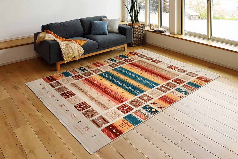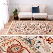 ラグの名産地トルコ製のウィルトンラグ。民族調手織り絨毯の様なエスニックなデザインをウィルトン織機で織り上げました。毛足は1cm程ありますが密度が高く、掃除機もかけやすいようデザインされています。縦糸の特殊加工により生地がやわらかく、折りたたんで収納出来ます。