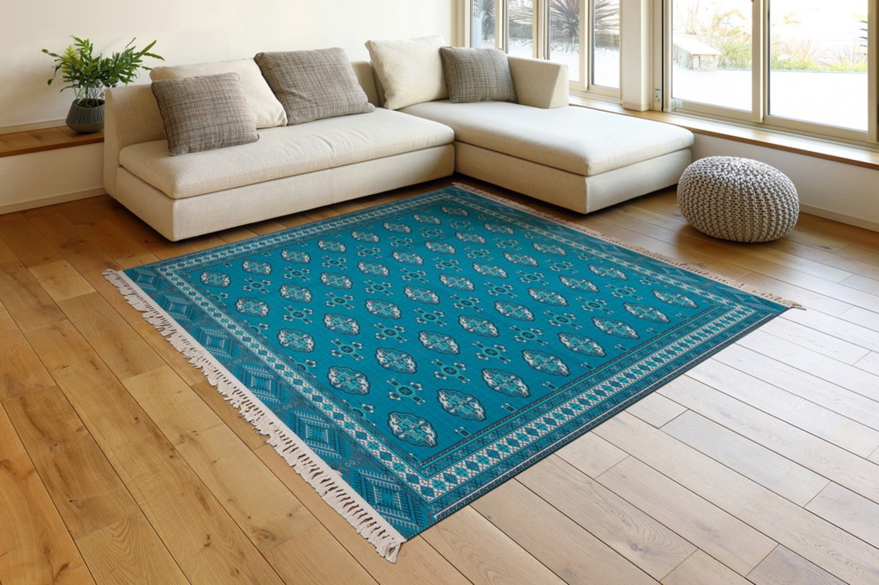 トルクメン風プリントラグ 約190×240cm ターコイズ