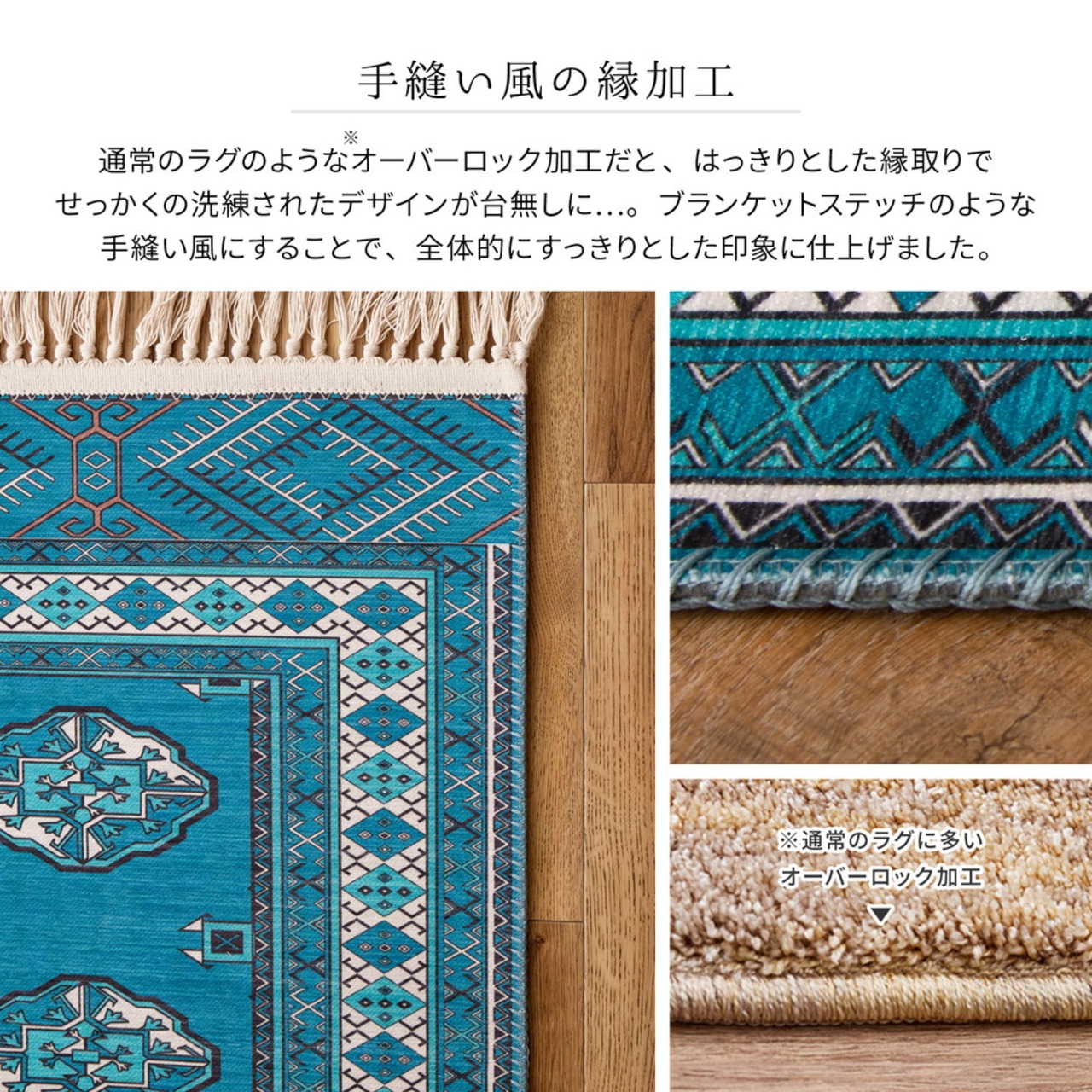 トルクメン絨毯とは、イラン北東部にすむトルコ系の遊牧民、トルクメン族によって昔から織り継がれている絨毯です。細かく丁寧な織り目としなやかで薄手に仕上げられるトルクメン絨毯は部族系ペルシャ絨毯の中でも細かな織りを誇り、正確なモチーフとシンプルな色遣いが垢抜けた印象を与えてくれます。そのトルクメンの風合いをプリントで繊細に再現しました!汚れても手洗いできます。裏面にはすべり止めが付いているので、ズレにくいのも嬉しいポイントです。