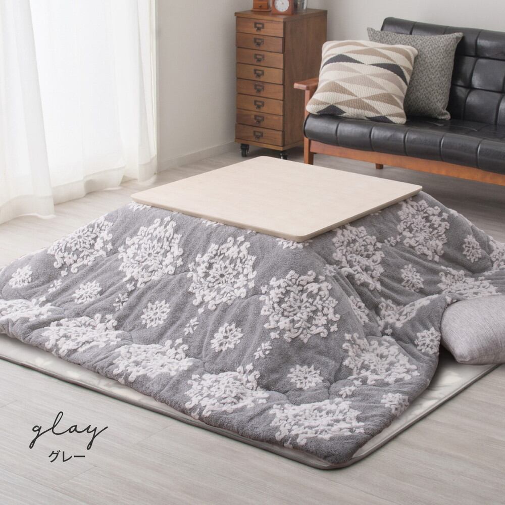 淡色遣いで派手すぎない、ささやかな可愛さの大人のフェミニン。収納もしやすい薄掛けタイプのこたつ布団です。