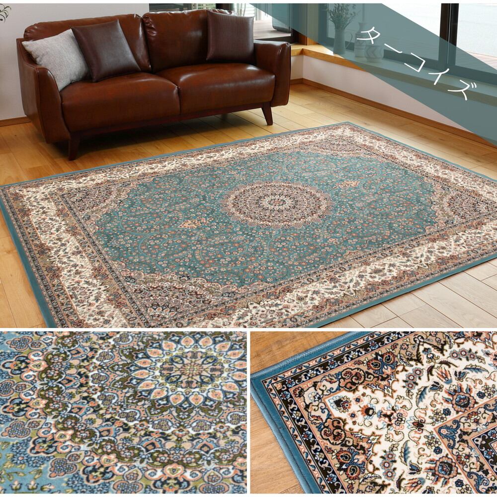 小さな模様も細部までしっかり表現!まるで高級絨毯のようなデザインの転写プリントラグ。毛足が短いため、さらさらした肌触りの良い感触とお手入れのしやすさが魅力です。なめらかな表生地には撥水加工を施し汚れにくく、また、手洗いできるため清潔にお使いいただけます。裏面はすべり止め付きでラグがズレるのを軽減します。