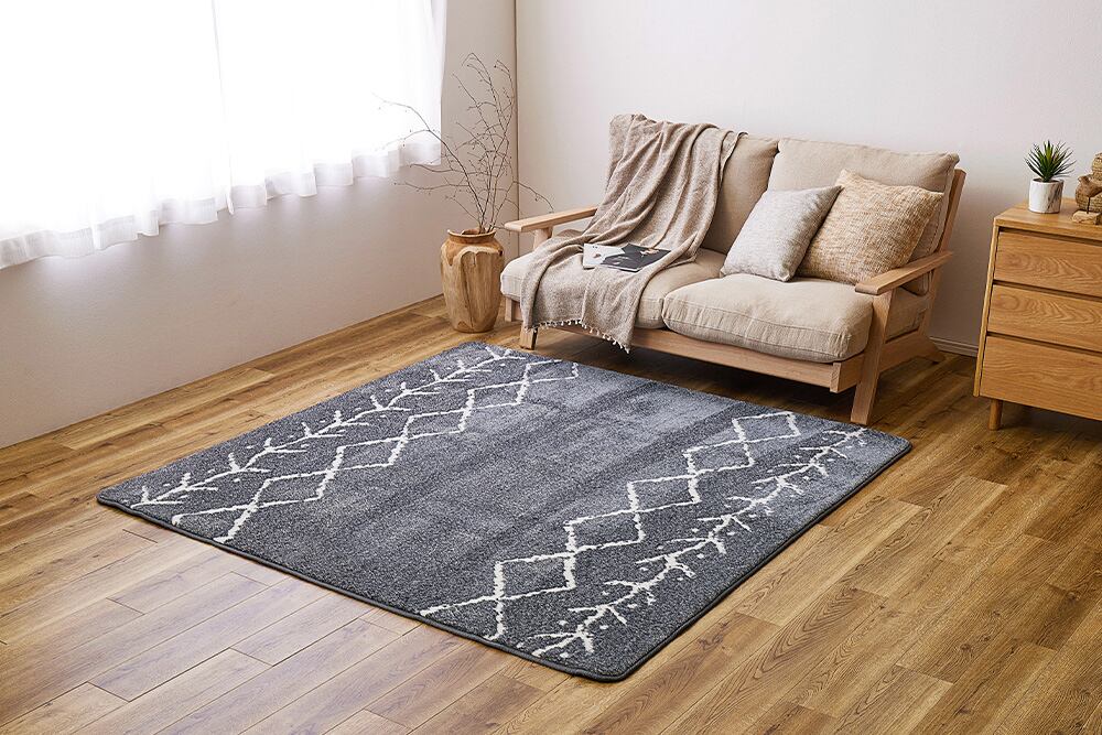ベニワレンとはモロッカン北部に住むベルベル民族によって作られるモロッカンラグ。手書き風のゆるいラインとぬくもりのあるデザインで派手すぎない、さりげないデザインが人気です。先染め加工で一般的なプリントラグより色に深みがあり高級感のある仕上がりに。ウレタン入りでもっちり、座布団いらずのふっくらラグ。