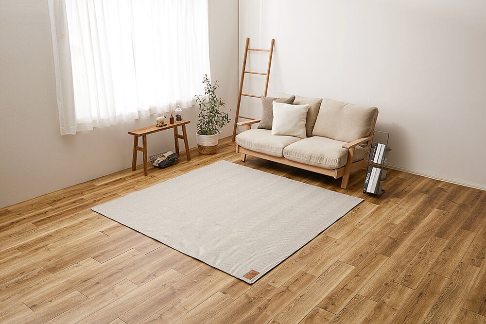 糸の組み合わせにこだわった、おしゃれなヘリンボンラグ。ざっくりとした織りで立体感があり、太めの間隔で仕上げたヘリンボン柄は、遠目で見るとボーダー柄のようにも見えるデザインに。ウレタン入りでほんのりふっくら、さらっとした肌ざわりで年中使いやすい素材感です。