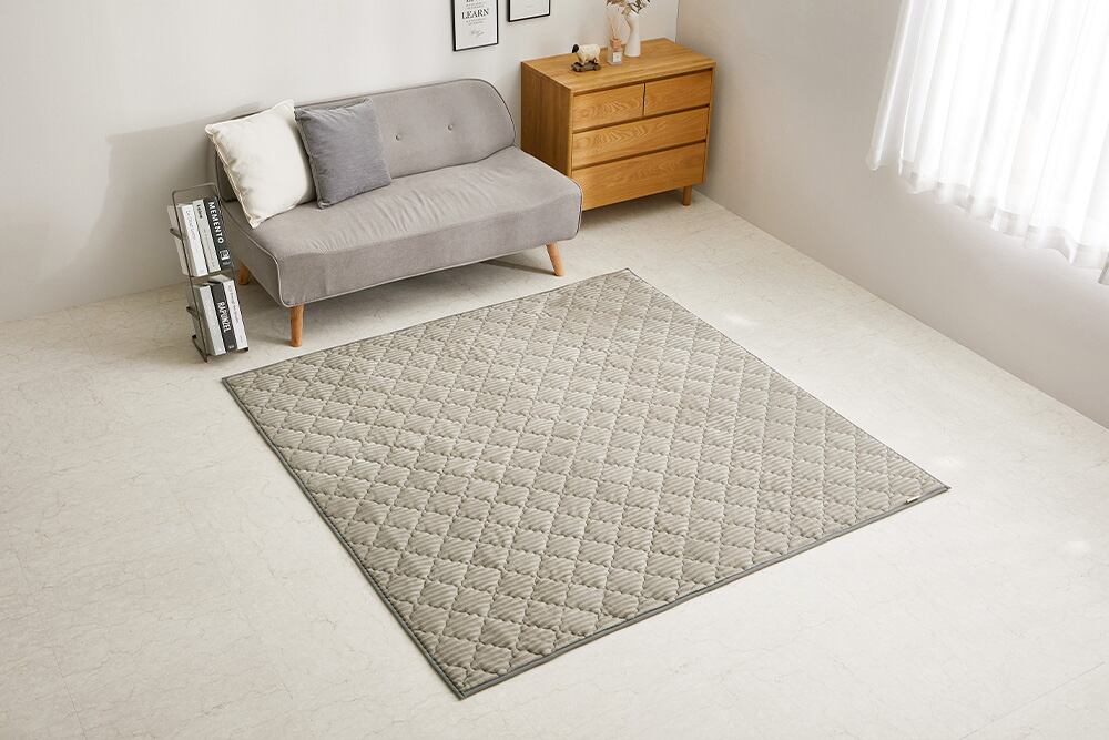 大人かわいいくすみカラーのふわふわラグ。短毛フランネルのなめらかなタッチと、ぽこぽことしたキルトが心地よい癒しの一枚に。中身をウレタンと綿を混合にすることで、ボリューム感を出しました。裏面には滑りにくい加工付きでラグがズレにくく、汚れても洗濯機で丸洗いできるから、小さいお子さまのいるご家庭でも安心してお使いいただけます。