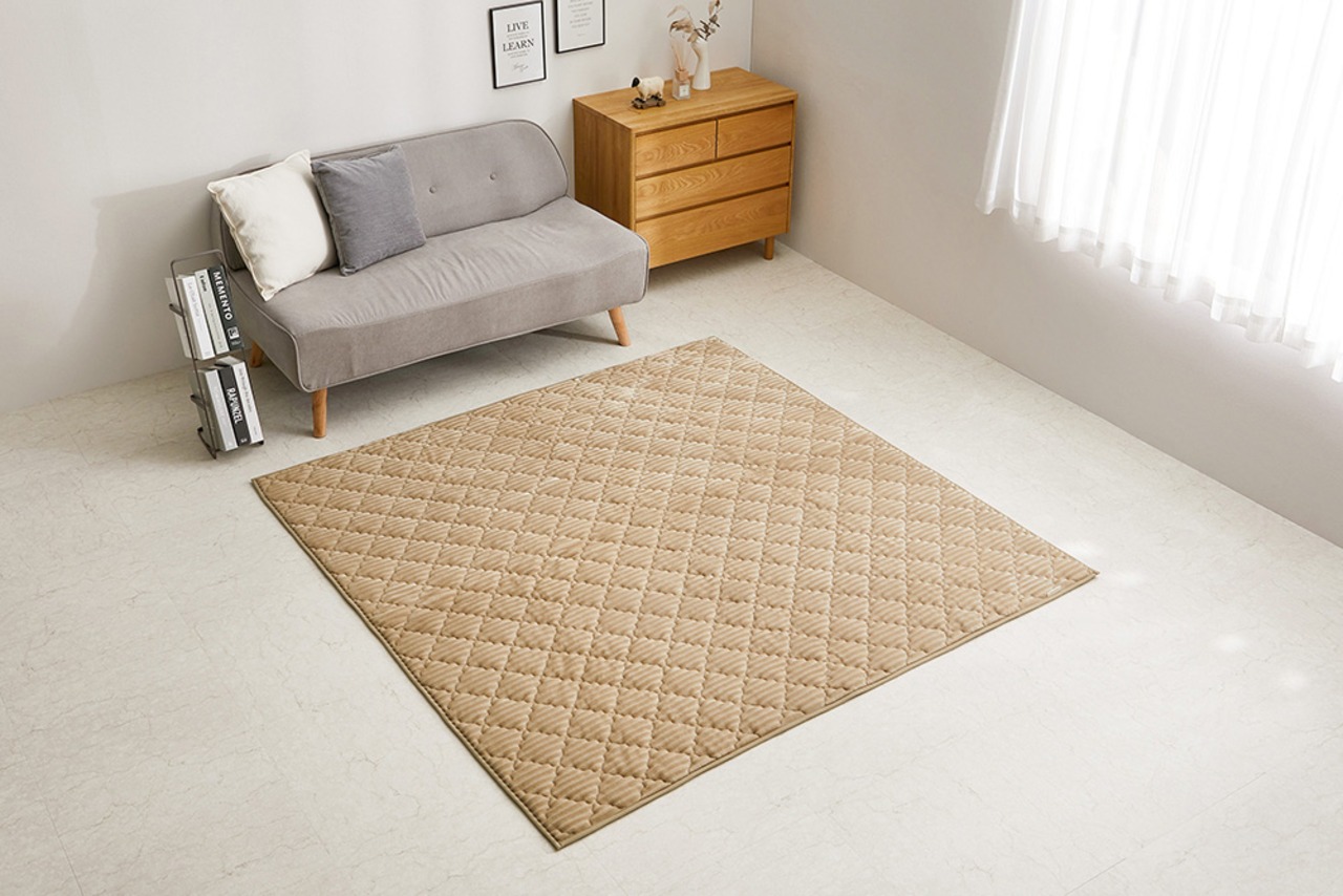 大人かわいいくすみカラーのふわふわラグ。短毛フランネルのなめらかなタッチと、ぽこぽことしたキルトが心地よい癒しの一枚に。中身をウレタンと綿を混合にすることで、ボリューム感を出しました。裏面には滑りにくい加工付きでラグがズレにくく、汚れても洗濯機で丸洗いできるから、小さいお子さまのいるご家庭でも安心してお使いいただけます。