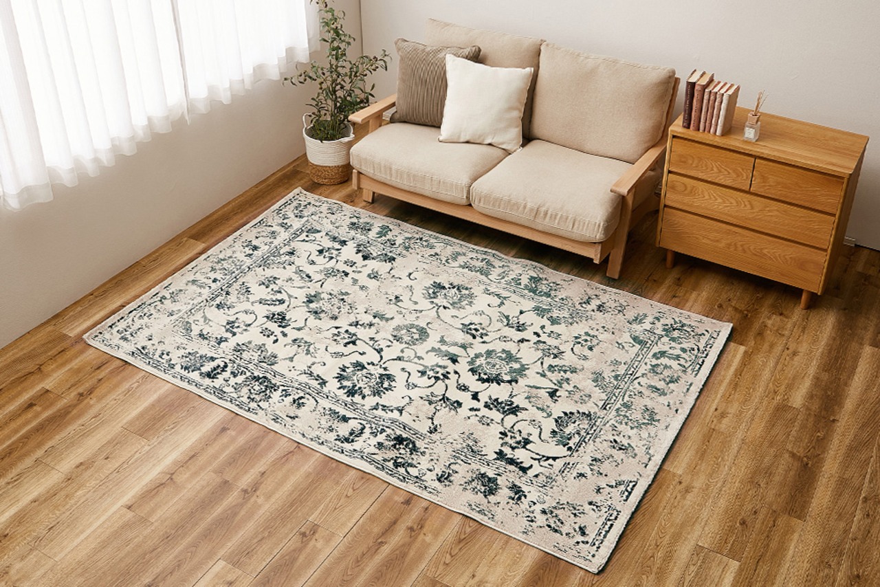 エジプト製のウィルトンラグ。オリエンタルな模様とシックな色合いの高級感のあるデザインは、インテリアのアクセントにぴったり。また、ウィルトンラグはパイルの密度が高く耐久性に優れ、お気に入りのラグを長く使いたい方にもおすすめです。