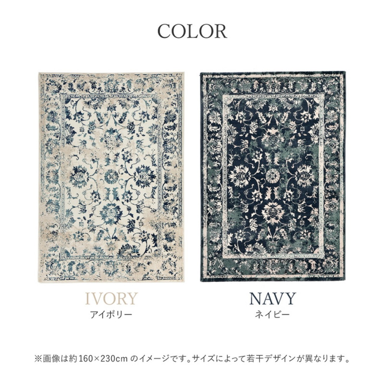 エジプト製のウィルトンラグ。オリエンタルな模様とシックな色合いの高級感のあるデザインは、インテリアのアクセントにぴったり。また、ウィルトンラグはパイルの密度が高く耐久性に優れ、お気に入りのラグを長く使いたい方にもおすすめです。