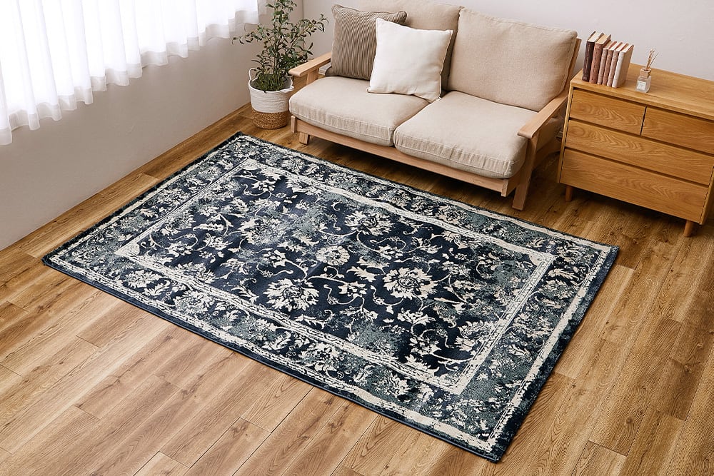 エジプト製のウィルトンラグ。オリエンタルな模様とシックな色合いの高級感のあるデザインは、インテリアのアクセントにぴったり。また、ウィルトンラグはパイルの密度が高く耐久性に優れ、お気に入りのラグを長く使いたい方にもおすすめです。