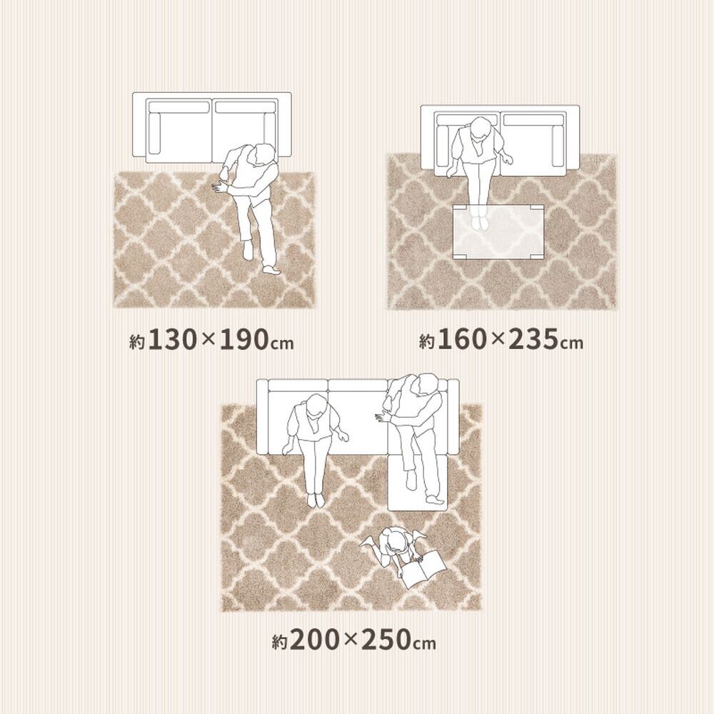 エジプト製のウィルトン織シャギーラグ。おしゃれなモダン柄とナチュラルなカラーでどんなインテリアにも合わせやすいデザインです。毛足が長くボリュームがあり、おもわず寝転びたくなるような心地良さの、ふわふわとやわらかな肌触り。また、ウィルトンラグはパイルの密度が高く耐久性に優れ、お気に入りのラグを長く使いたい方にもおすすめです。