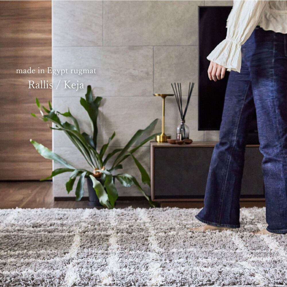 エジプト製のウィルトン織シャギーラグ。おしゃれなモダン柄とナチュラルなカラーでどんなインテリアにも合わせやすいデザインです。毛足が長くボリュームがあり、おもわず寝転びたくなるような心地良さの、ふわふわとやわらかな肌触り。また、ウィルトンラグはパイルの密度が高く耐久性に優れ、お気に入りのラグを長く使いたい方にもおすすめです。