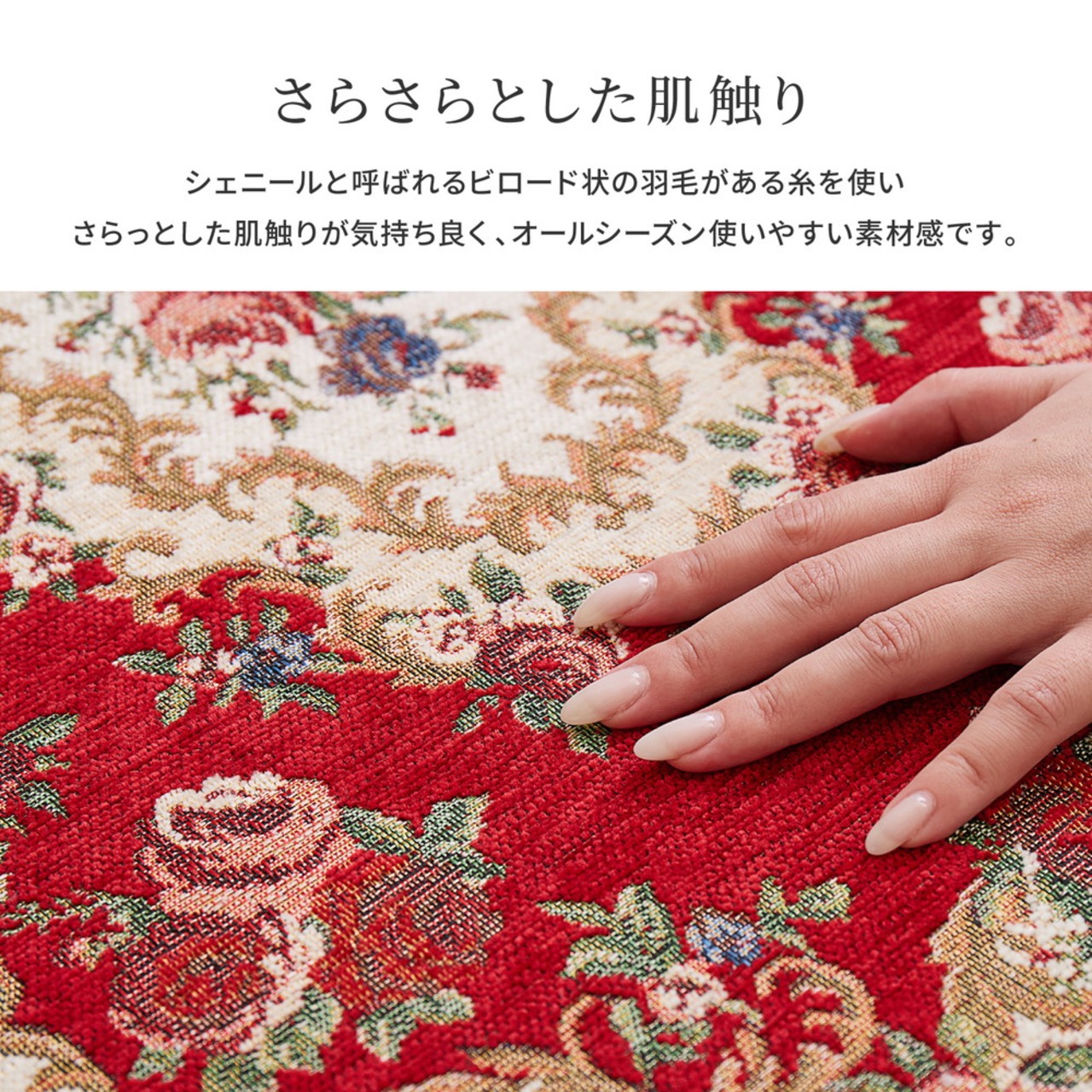 ちょっぴりゴージャスで刺繍のような柄が特徴のゴブラン織のマットです。