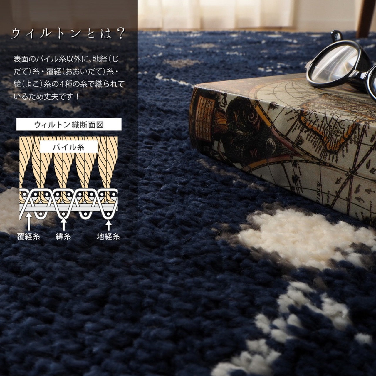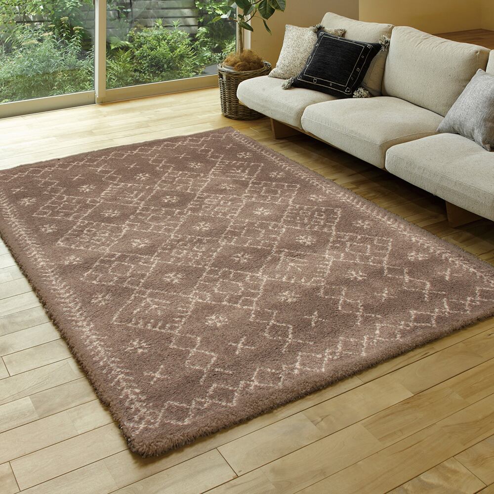 人気のギャッベ風デザインを表現したウィルトン長毛ラグ。民族調のあたたかみのある雰囲気が、空間をやさしく包み込みます。約35mmの長い毛足は、指先が埋まるほどのぎゅっと詰まったパイル密度で、ふわふわで極上の気持ちよさです。ヒートセット加工を施すことにより、ウールに似たタッチ感やへたりにくさをプラスしました。耐久性に優れているウィルトン織なので、長く使いたい方におすすめです。