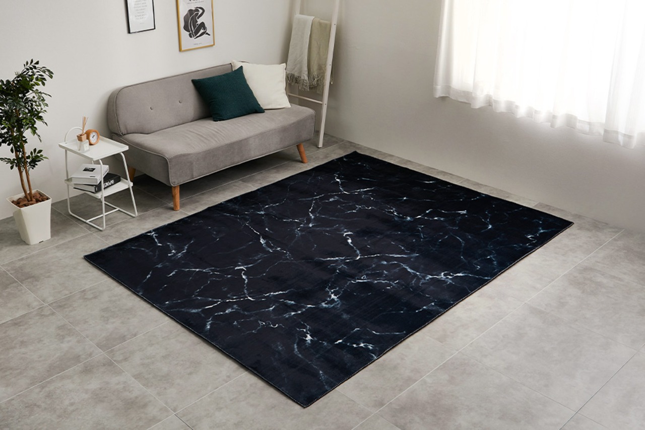 上品で高級感のある大理石柄のプリントラグ。海外風インテリアや、ホワイトコーデにもあうシックなデザインです。ソフトフランネルのなめらかな肌触りは、思わず素肌で触れたくなるようなタッチ感。短毛でやわらかく、コンパクトに折りたためるから収納にも困らず、お手入れも簡単。汚れても洗えるからいつも清潔にお使いいただけます。裏面には滑り止め付きでフローリングの上でもズレにくく安心。寒い季節もあたたかく過ごせるよう、ホットカーペット・床暖房に対応しています。