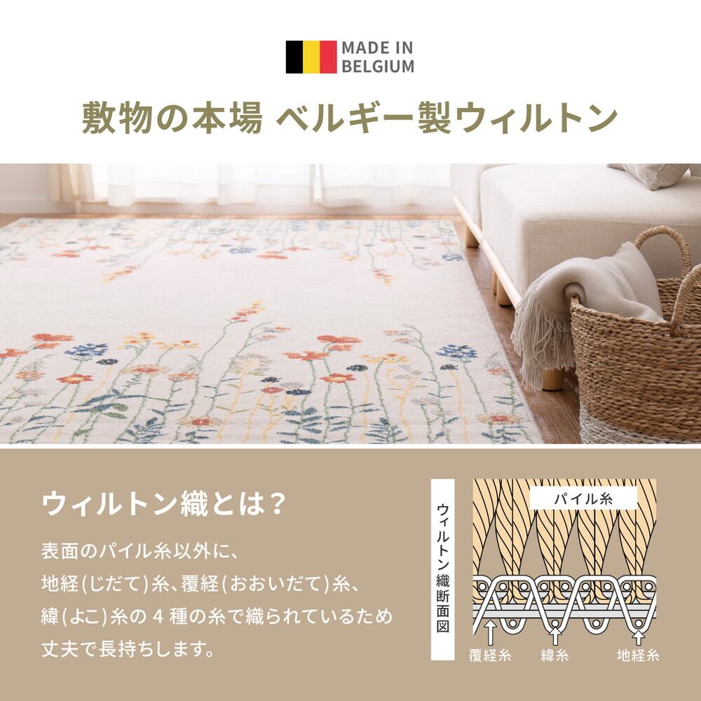 ウィルトン織りは表面のパイル糸を下糸に直接絡み合わせて織り込んでいる為、パイルが抜けにくく耐久性に優れた仕上がりになってます。繊維にする前の原料で着色するので日光による色あせが少なく、ヒートセット加工を施すことで遊び毛も出にくく、ウールのような質感に。ホットカーペット・床暖房対応で、オールシーズンお使いいただけます。