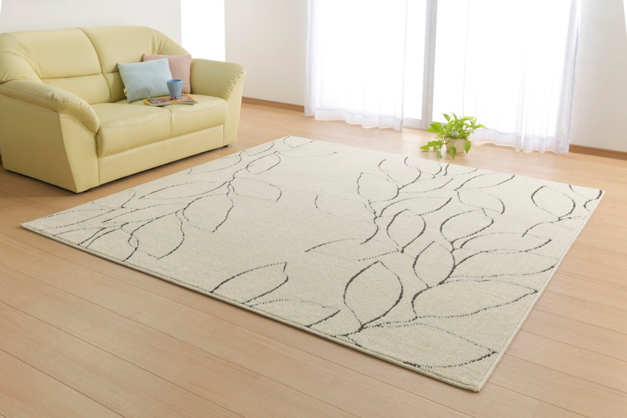 ふんわりとやさしいマシュマロタッチ。淡い色合いと、葉っぱのデザインがやわらかな印象のラグです。防ダニ・抗菌防臭機能付きで家族が安心してくつろげる空間に。ホットカーペット・床暖房対応でオールシーズン快適にお使いいただけます。