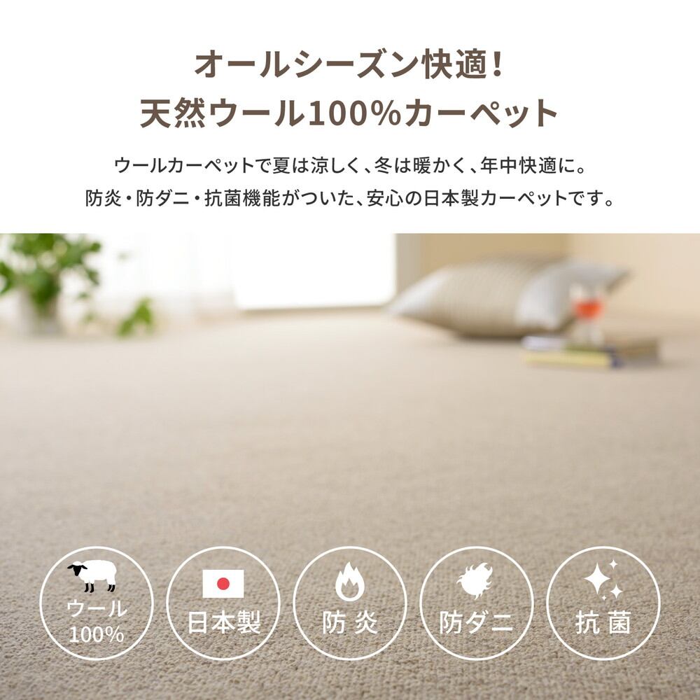 防炎・防ダニ・抗菌加工付きだから安心して使える、天然ウール100%のカーペットです。